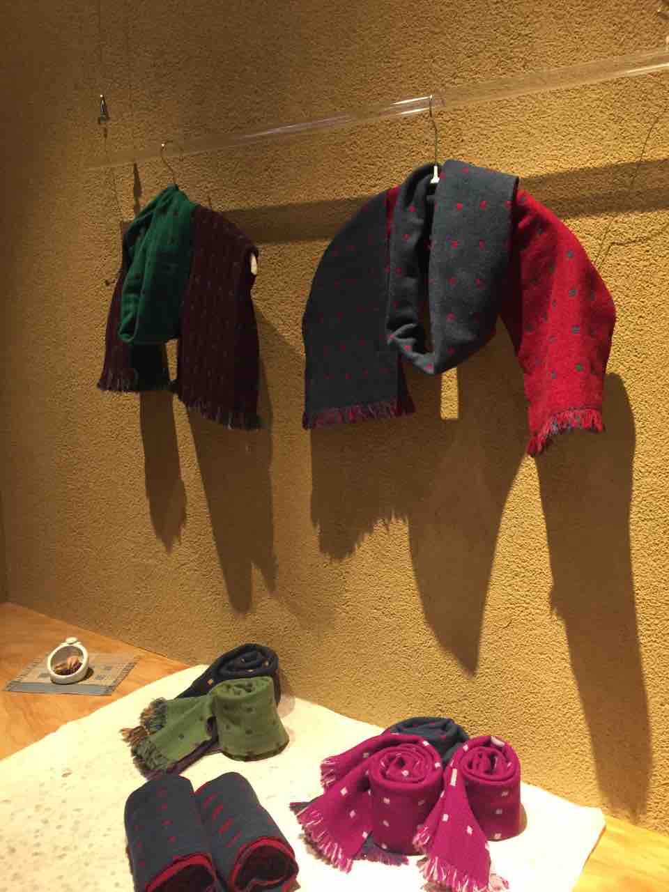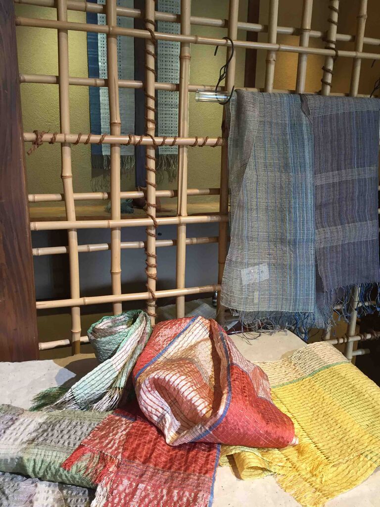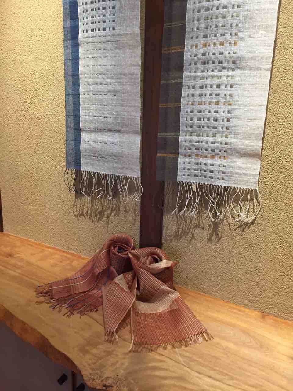 シルク、カシミアの糸を草木で染め上げ織ったマフラー、タペストリーなど