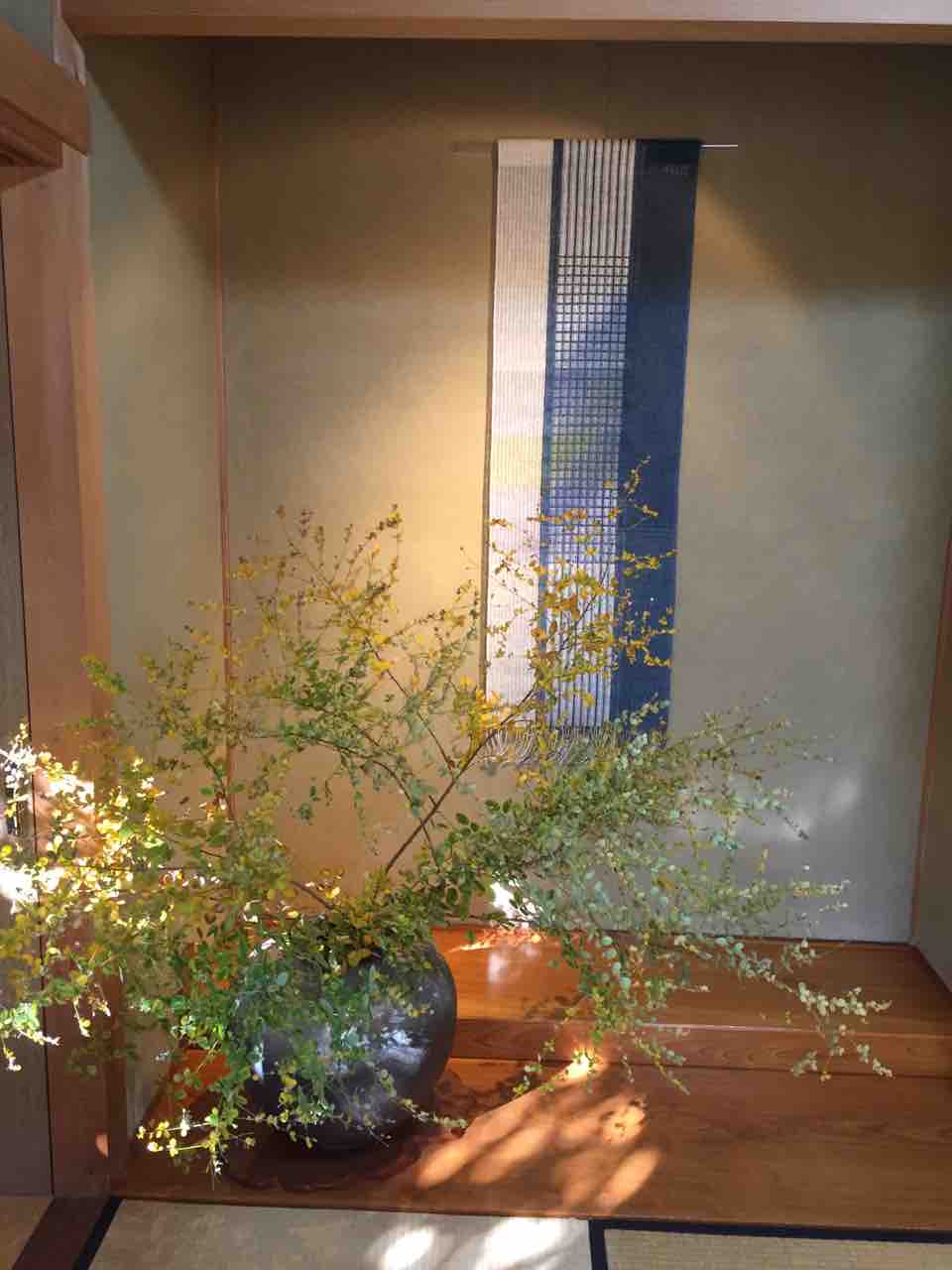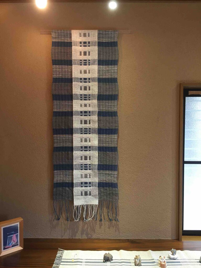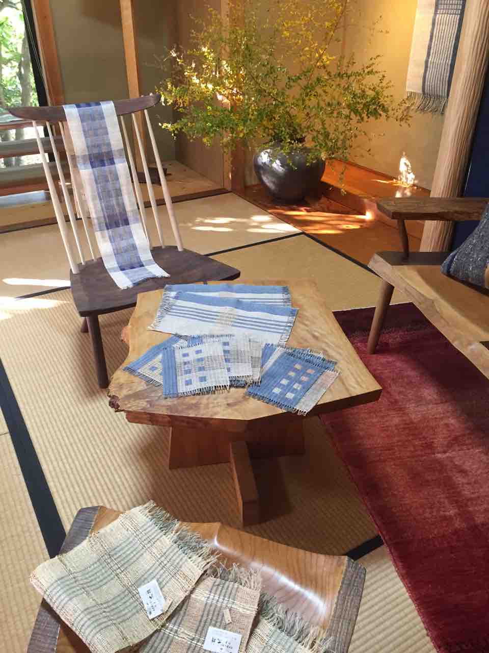 シルク、カシミアの糸を草木で染め上げ織ったマフラー、タペストリーなど
